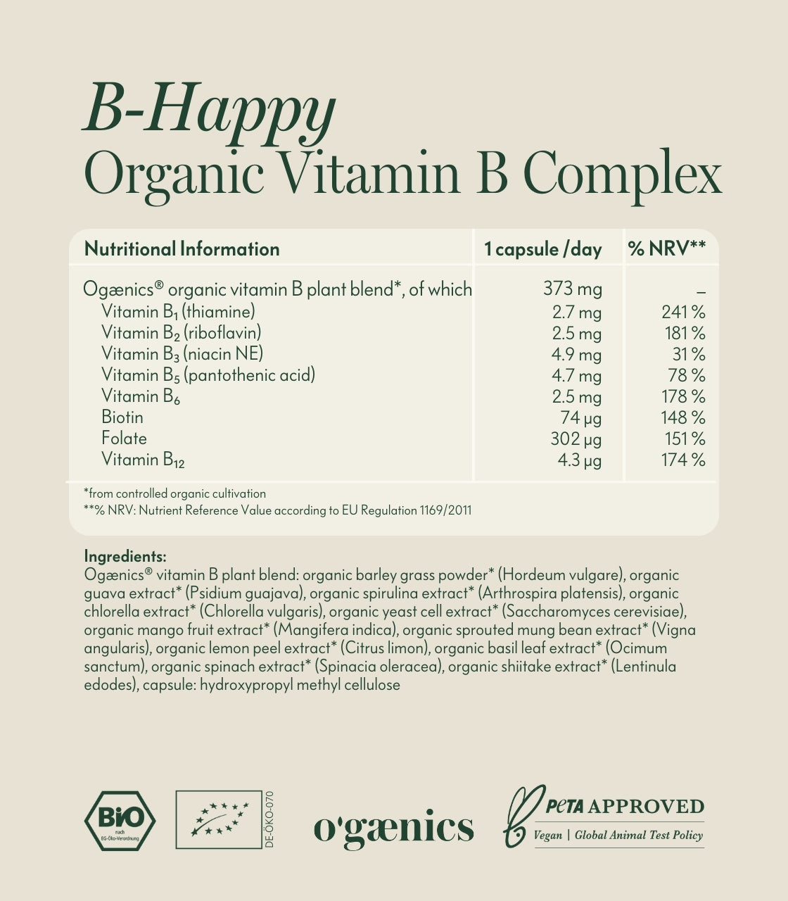 Ogaenics Organic Vitamin B Plant Blend: Organic Barley Grass Powder* (Hordeum Vulgare), Organic Guava Extract* (Psidium Guajava), Organic Spirulina Extract* (Arthrospira Platensis), Organic Chlorella Extract* (Chlorella Vulgaris), Organic Yeast Extract* (Saccharomyces Cerevisiae), Organic Mango Fruit Extract* (Mangifera Indica), Organic Mung Bean Sprout Extract* (Vigna Angularis), Organic Lemon Peel Extract* (Citrus Limon), Organic Basil Leaf Extract* (Ocimum Sanctum), Organic Spinach Leaf Extract* (Spinacia Oleracea), Organic Shiitake Extract* (Lentinula Edodes)