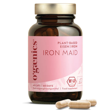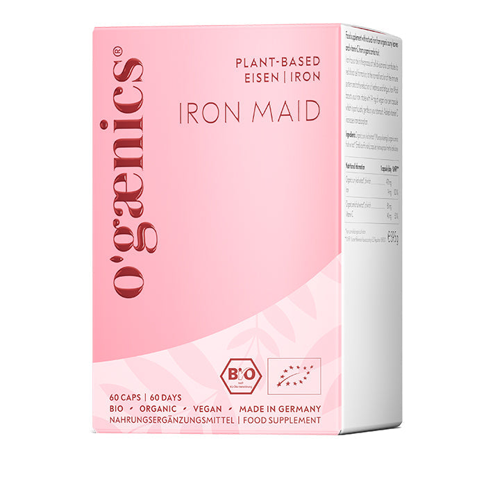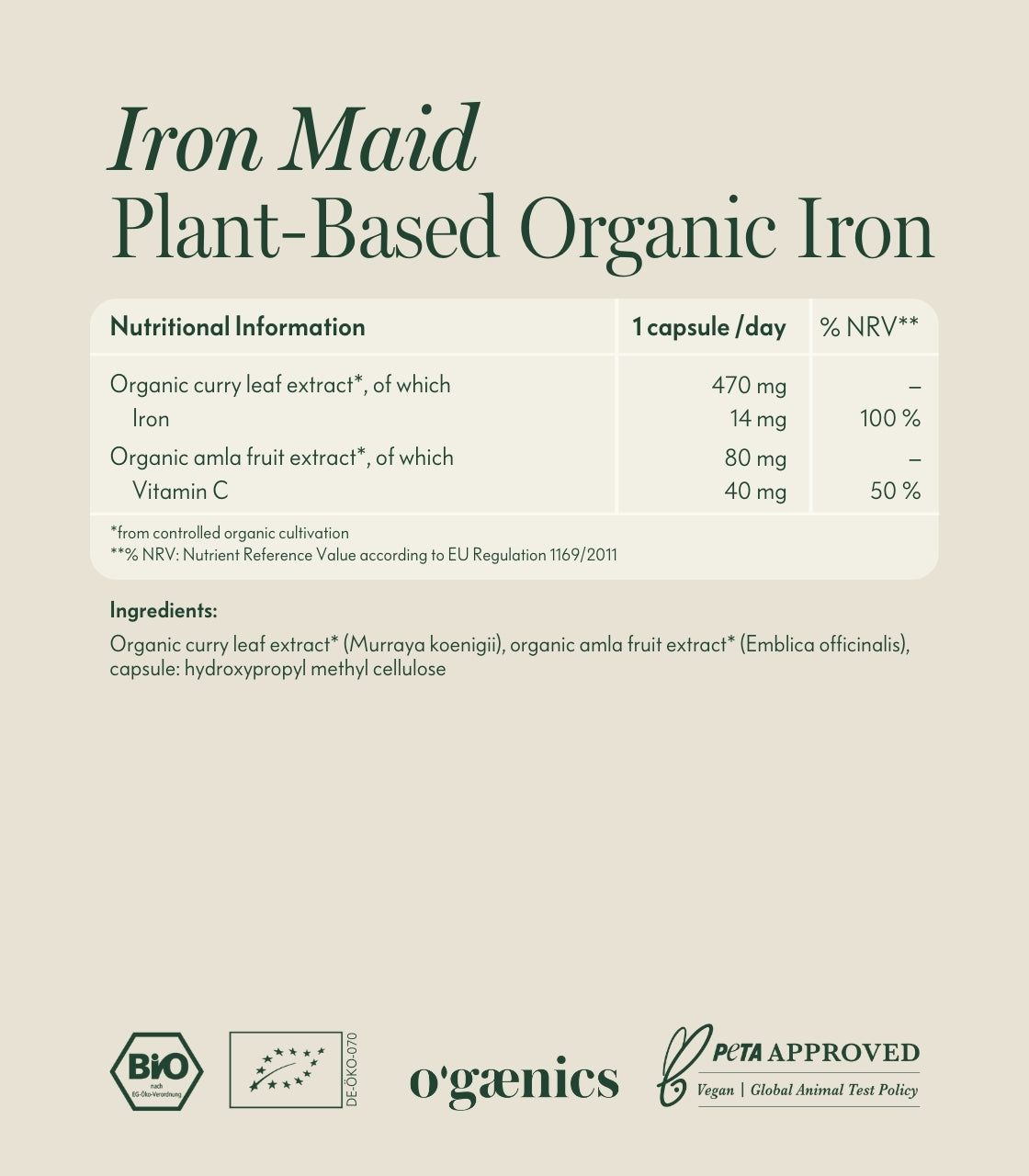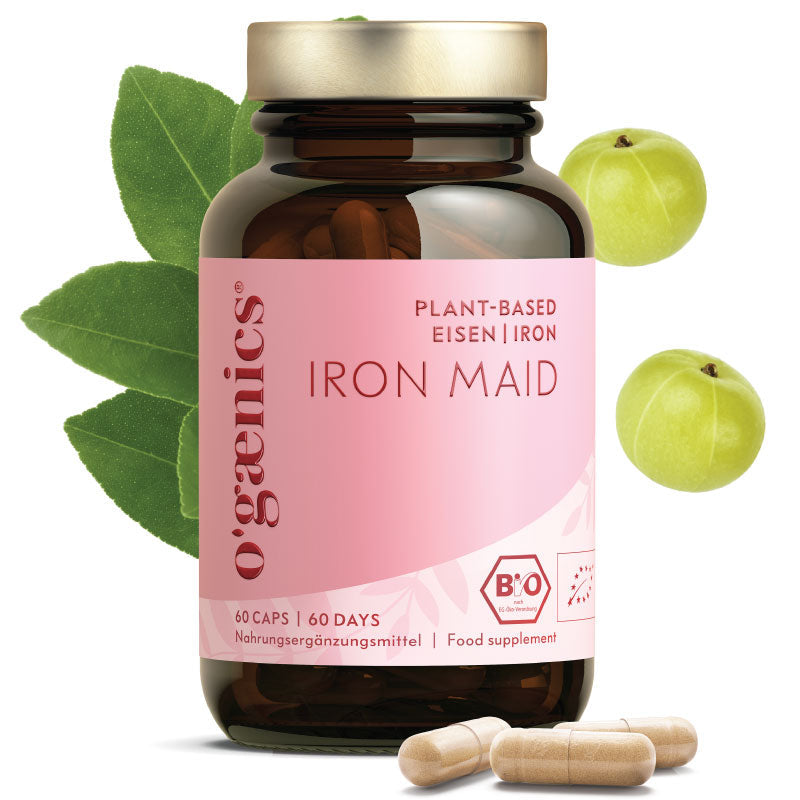 Iron Maid offers iron from organic curry leaves and vitamin C from organic amla fruits. It boosts the iron intake with 14mg of vegan iron per capsule for proper daily supply and is particularly gentle on the stomach. Added vitamin C increases iron absorption. It is ideal for vegans and vegetarians who are usually not well supplied with iron due to their diet, as well as for teenage girls and women who often need extra iron to replenish their levels after their period since three in four women under the age of 50 do not receive an optimal supply of iron through their diet. Same applies to vegans. Also well suited for athletes and blood donors.
