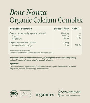 Bone Nanza supports the body with 602 mg of vegan calcium together with the co-factors magnesium and vitamin D for optimal absorption/utilisation of the calcium. Ideal for those who follow a dairy-free diet, as well as for periods of growth with children, pregnancy, breastfeeding and for women in and after menopause.