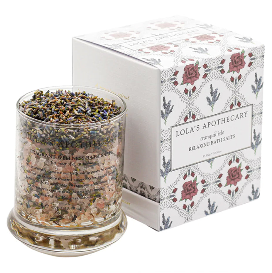 At the luminous heart of this Bath Salt is Tranquil Isle, a grounding blend with a sleepy heart of lavender and roman camomile, supported by an earthy base of cedarwood and vetivert, subtly brightened by a whisper of lemon in the top note. This scent evokes a sense of deep oceanic calm as you drift away across a sea of lavender - the kind of safety and tranquillity that is experienced in restful solitude.